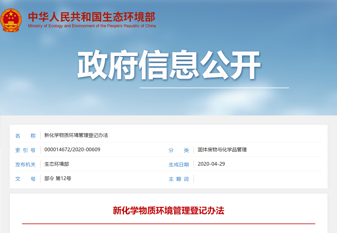 《新化学物质环境管理登记办法》已于2020年2月17日由生态环境部部务会议审议顺利获得,现予公布,自2021年1月1日起施行。2010年1月19日原环境保护部发布的《新化学物质环境管理办法》(环境保护部令第7号)同时废止。