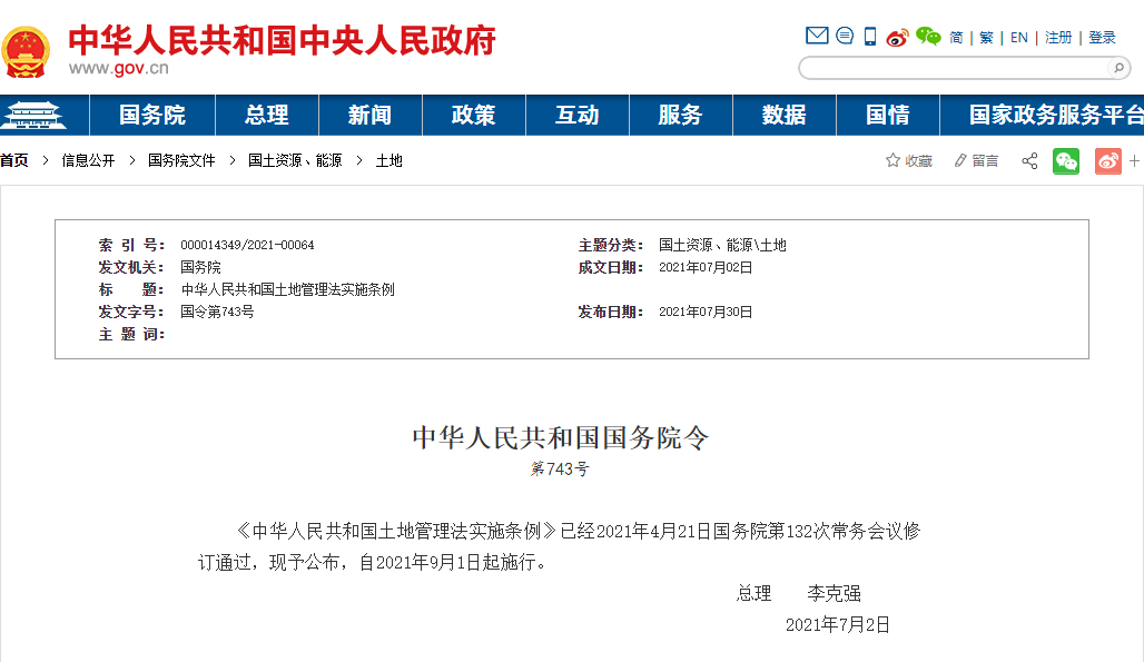 《中华人民共和国土地管理法实施条例》(中华人民共和国国务院令第743号),2021年9月1日起施行