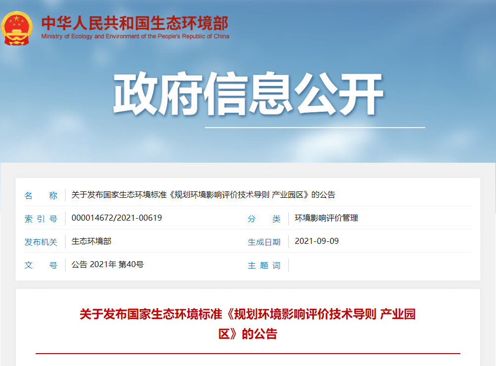 关于发布国家生态环境标准《规划环境影响评价技术导则 产业园区》的公告