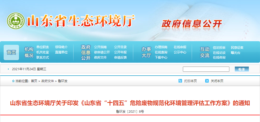 山东省生态环境厅关于印发《山东省“十四五”危险废物规范化环境管理评估工作方案》的通知