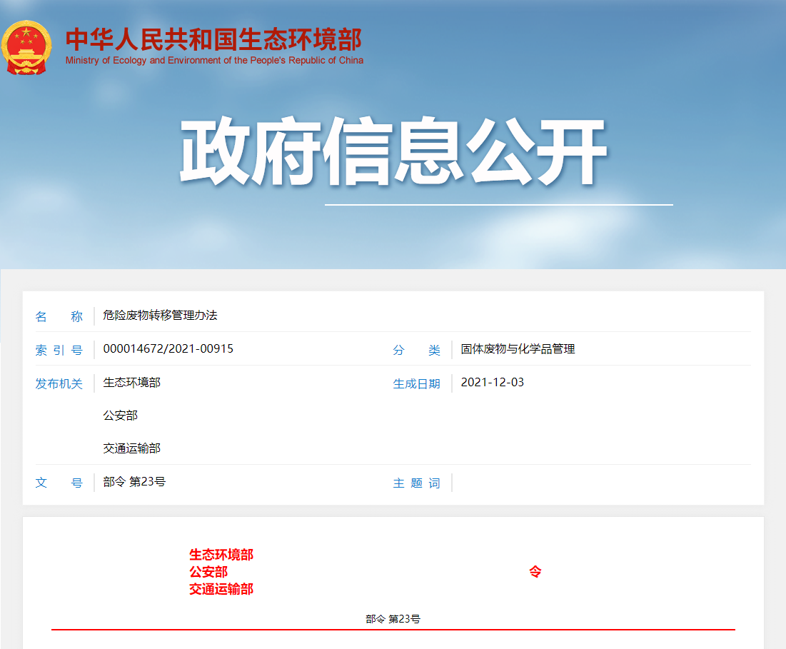 《危险废物转移管理办法》已于2021年9月18日由生态环境部部务会议审议顺利获得,并经公安部和交通运输部同意,现予公布,自2022年1月1日起施行。
