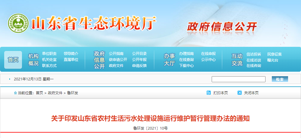 关于印发山东省农村生活污水处理设施运行维护暂行管理办法的通知