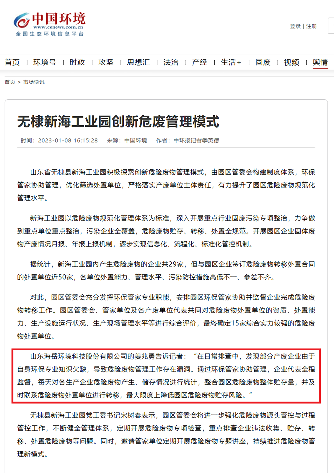 同时,该报告书项目也是公司为无棣新海工业园区给予环保管家服务的拓展延伸。自2020年中标成为该园区的环保管家以来,我公司的系统化专家服务深受园区管委及企业认可,服务成效显著,《中国环境报》、省生态厅官网等多次表扬报导。