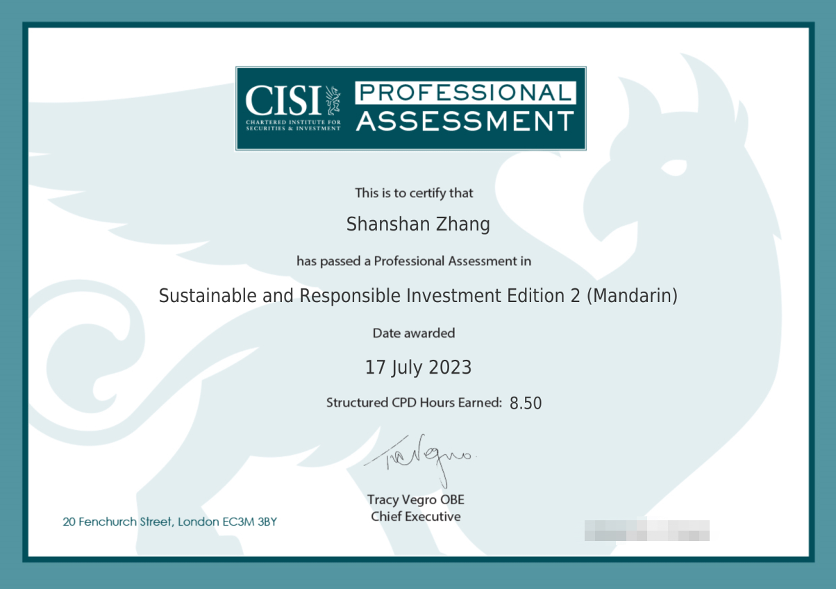 近期,山发Ebpay环境张姗姗、林旖旎首批顺利顺利获得了英国特许证券与投资协会(CISI)组织的考核评估,取得该组织签发的可持续与负责任投资专业评估认证(Sustainable and Responsible Investment)证书。该证书得到英国、卢森堡、澳大利亚等多国领先金融组织的认可,也是中文世界首个国际认证的ESG证书。