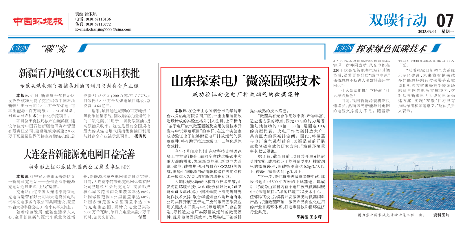 又上报纸啦!——我公司“微藻固碳技术开发及中试示范项目”再获《中国环境报》报导