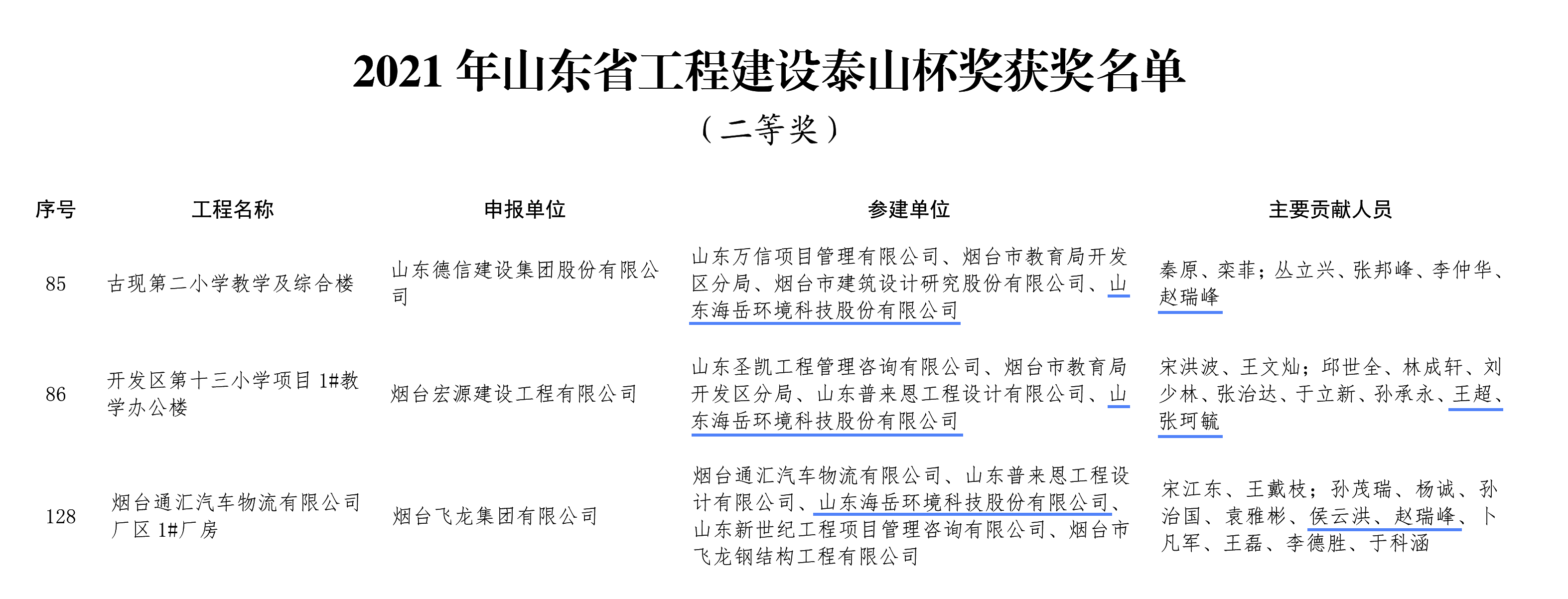 近期,山东省住房和城乡建设厅发文,发布了《关于表彰2021年山东省工程建设泰山杯奖的通报》,我公司参与承建的“古现第二小学教学及综合楼项目”、“开发区第十三小学项目1#教学办公楼项目”及“烟台通汇汽车物流有限公司1#厂房”等三个项目喜获全省“泰山杯”二等奖。