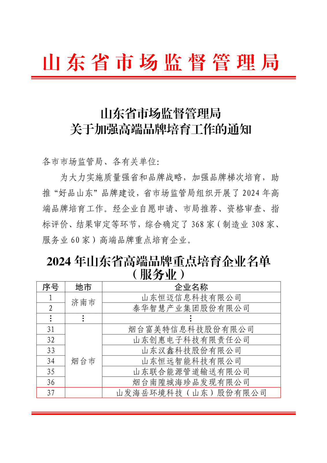 近期,省市场监督管理局公布了2024年山东省高端品牌重点培育企业名单,共确定高端品牌重点培育企业(服务业)60家,我公司作为科技咨询服务企业,成功入选该名单。