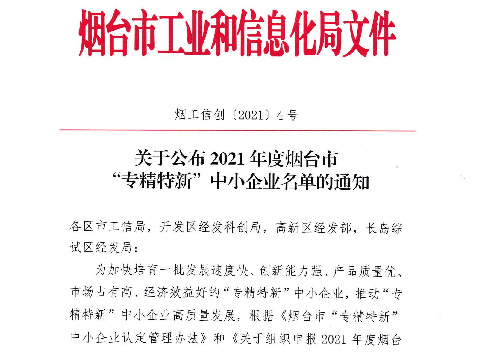 今天,从烟台市工业和信息化局传来好消息:经区经发科创局初审推荐、市工信局组织专家评审、局党组扩大会议研究、网站公示等程序,批准认定我公司为烟台市“专精特新”中小企业,有效期三年。